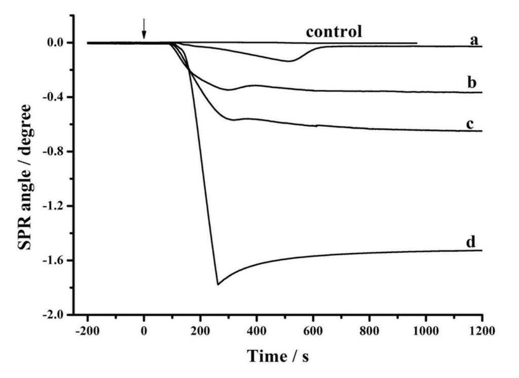 FIG. 2 SPR sensorgrams recorded upon injecting 1 mM CN and 0.3 mM H2O2 onto the surfaces that have been treated with four ODN targets with different sequences: a non-complementary sequence to the capture probe (a), four bases mismatching to the capture probe (b), one base mismatching to the capture probe (c), and a complementary sequence to the capture probe (d). The control sensorgram was obtained at a sensor chip covered with the capture probe/target duplex that had been exposed to the HRP-tagged streptavidin. The concentration of the target used was 50 fM. The arrow indicates when the injections were made.
