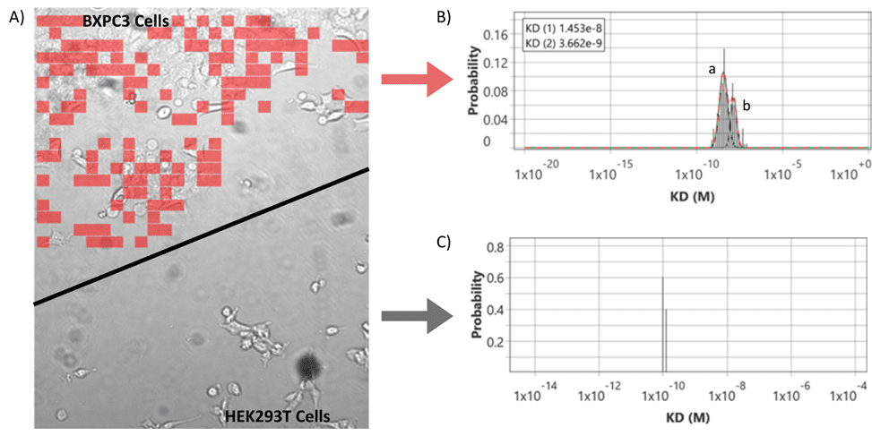 Data analysis involved the delineation of regions of interest (ROIs) around each type of cell so that the binding response could be quantified independently. Each cell population was analyzed with the same number of regions of interests (ROIs). The kinetic analysis generates two data files, with binding activity and kinetic information for each of the cell types. The kinetic results revealed two distinct anti-MUC4 binding interaction modes to the BxPC3 cells that express the target receptor (Figure 2B). Binding interaction of anti-MUC4 showed two distinct modes (a and b) due to the bivalency of the antibody and the presence of heterogenous binding populations. On the other hand, no binding response was seen for the HEK293T cells (Figure 2C), thereby demonstrating the specificity of the interaction.
