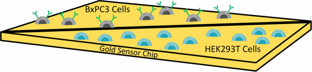 Figure 1: Schematic showing the SPRM setup with the two-well SPRM chip which has BxPC3 cells on one side and HEK293 cells seeded on the other side of the barrier.