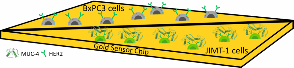 In the current study, BxPC3 cells, with whom HER2 expression and responsiveness to Herceptin have been previously confirmed, were combined with JIMT-1 cells, which, as previously reported, lack functional binding response despite HER2 expression due to the masking of the HER2 receptor by a glycoprotein named MUC-4.4 This setup allowed for side-by-side real-time observation of specific versus non-specific interactions (Figure 1).