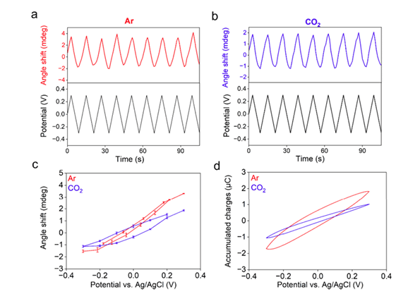 EC SPR was performed using BI-2500 to investigate the difference between the interfacial capacitance of gold chips in 0.1 M sodium sulfate in two different environments: one saturated with argon (Ar, pH ≈ 7.0) and the other with carbon dioxide (CO₂, pH ≈ 4.0). Figure 2a, b and c show the oscillating changes of the SPR angle when cyclic voltammetry was performed between −0.3 to +0.3 V at 100 mV/s. SPR angle changed with applied voltage in both cases, but the response was significantly altered in the presence of CO₂. Specifically, capacitance decreased by 5–22% in the presence of CO2, with variation depending on electrolyte state, having more variation at more extreme potentials. This suggests molecular CO₂ to accumulate in the diffuse layer of the electrode interface, lowering surface charge and interfacial capacitance. The work sheds light on how CO₂ influences charge dynamics at the interface and points toward factors that may enhance CO₂ uptake in aqueous electrochemical systems like SSA. CO₂ made some definite changes in the SPR response, indicating that dissolved CO₂ plays a role in interfacial charge dynamics. The shift of the SPR angle arises from the accumulation/depletion of capacitive charge, shown in Figure 2d.